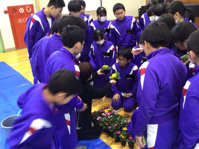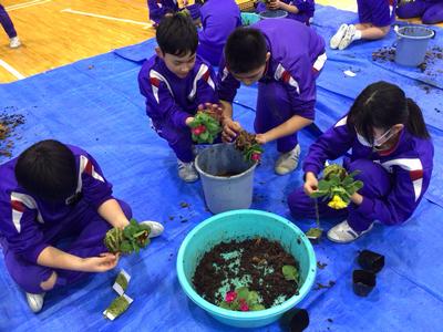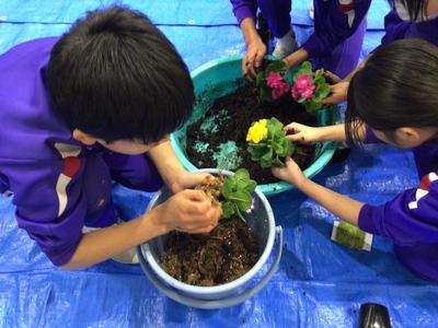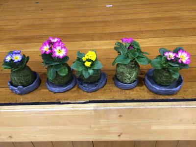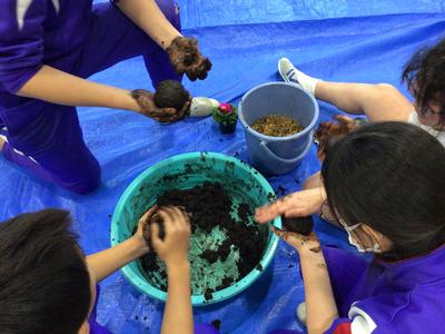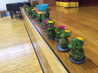 神山農園さんから講師をお招きして、6年生が苔玉づくりに挑戦しました。この苔玉づくりは今から8年前に始まり、毎年6年生が卒業記念を兼ねて行っています。手を泥だらけにしながらも、最後は全員が美しい苔玉を完成させました。出来上がった苔玉は、以前に越前瓦用の粘土で作った皿の上に飾られ、綺麗な花とのコントラストが見事な風情のある苔玉となりました。神山小学校での素敵な思い出が、また一つできましたね。