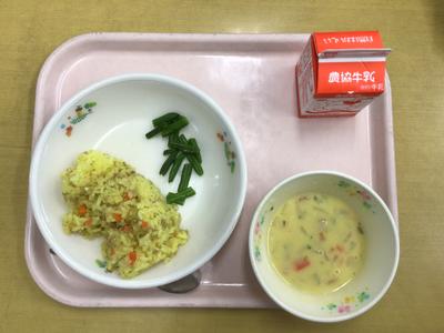 今日の献立はカレーピラフ、ボイルいんげん、コーンポタージュ、牛乳でした。3年生教室の様子です。