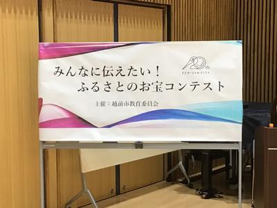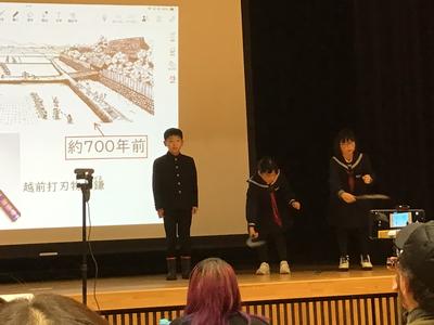 1月31日(土)に越前市生涯学習センターeホールにて、「みんなに伝えたい!ふるさとのお宝コンテスト」が開催されました。このコンテストは、市内の17小学校の3年生がふるさと越前市の文化や歴史に触れる体験・探究活動を行い、感じたことや考えたことを表現・発信するものです。ども学校の発表も工夫が凝らされ素晴らしく、本校からも代表の4名が、多くの人たちを前に、ステージ上で越前打刃物の魅力について堂々と発表してくれました。4名の発表者のみなさん、お疲れ様でした。また、引率の保護者の方々、温かい声援をありがとうございました。