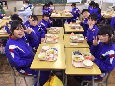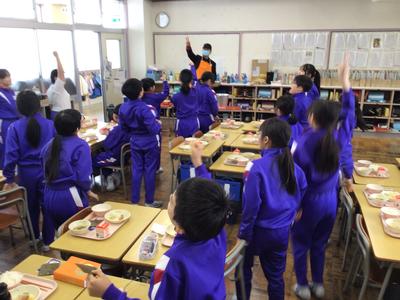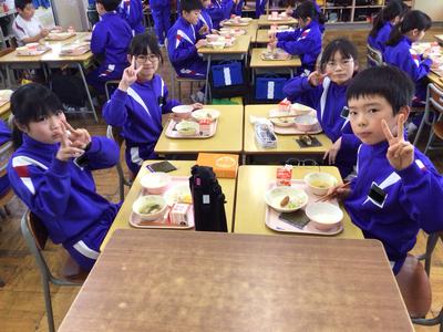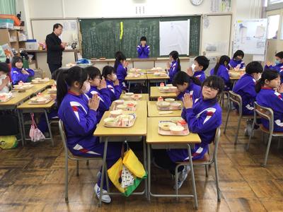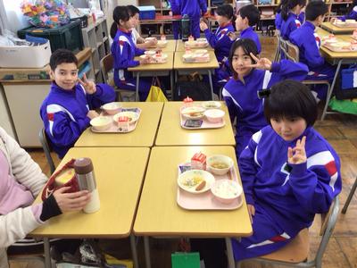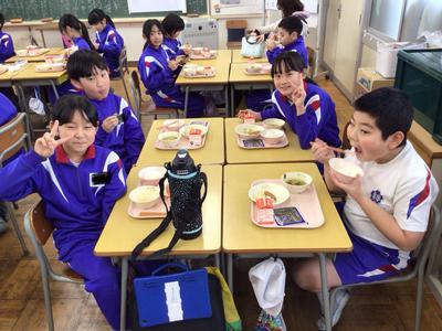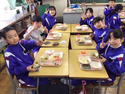 今日の献立は恵方巻き、豆腐のすまし汁、牛乳の節分献立でした。4年生教室の様子です。今年の恵方である南南東の方を向いて無言で恵方巻きを食べる子がたくさんいました。