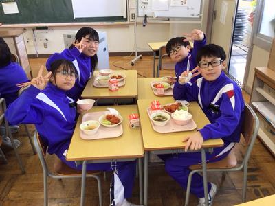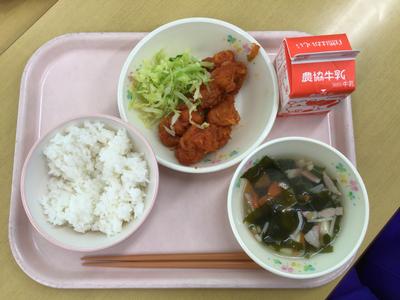 今日の献立はご飯、鶏肉のチリソース煮、ボイルキャベツ、わかめのスープ、牛乳でした。5年生教室の様子です。