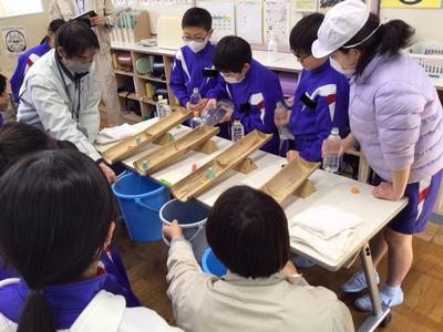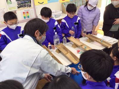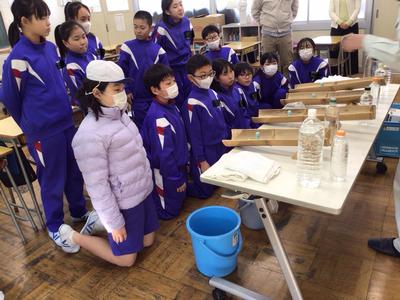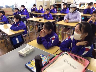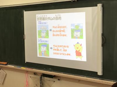 福井県吉野瀬川ダム建設事務所から講師をお招きして、5年生を対象に出前講座が開催されました。ダムの役割や作る目的、作り方などを画像や映像、実験を交えながら楽しく教えていただき、ダムの重要性を理解することができました。神山地区に新たに作られた吉野瀬川ダムがまもなく運用されることにより、大雨が降っても洪水の心配がなくなります。今度はぜひ吉野瀬川ダムを実際に見学したいと考えています。