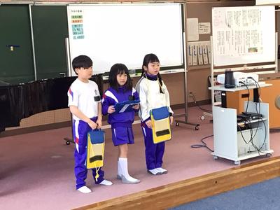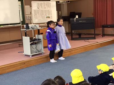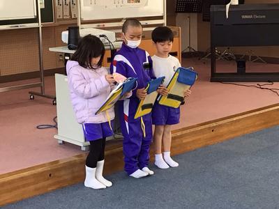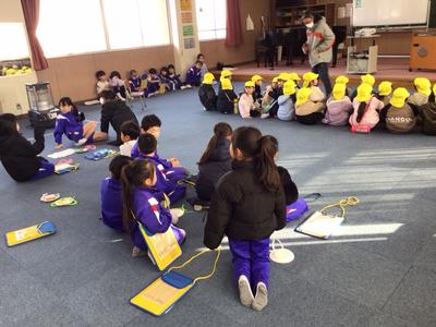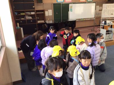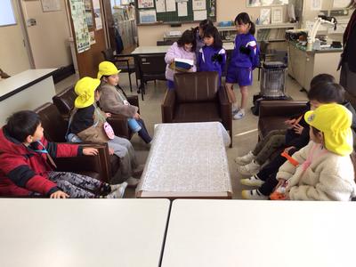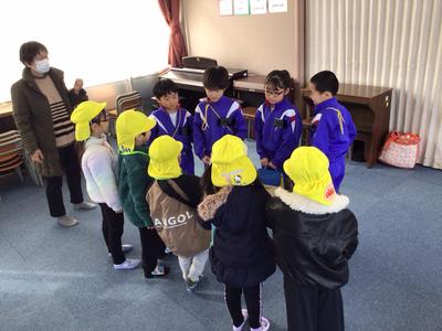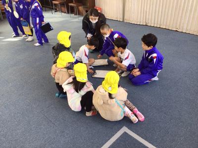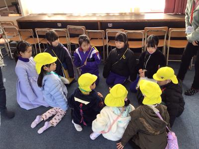 4月から本校に入学するこども園の年長さん26名が来校し、体験入学が行われました。1年生は年長さんに楽しんでもらおうと、これまで準備や練習に励んできました。音楽室で小学校生活の紹介をした後、グループ毎に自己紹介をし、学校内を案内しました。一足早くお兄さん・お姉さん気分を味わうことができたのではないでしょうか。4月に再会できるのが楽しみですね。