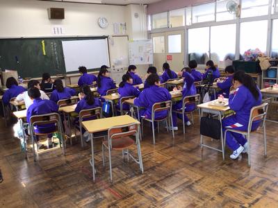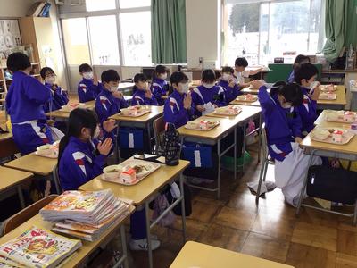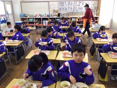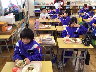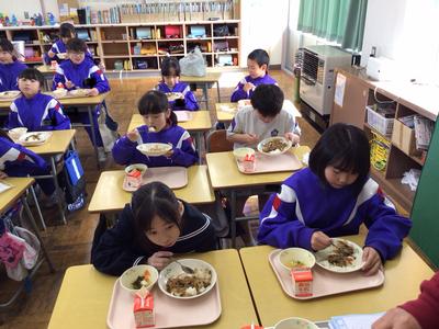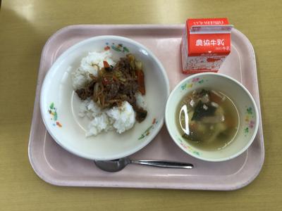 今日の献立はプルコギ丼、えのきとわかめスープ、牛乳でした。4年生教室の様子です。