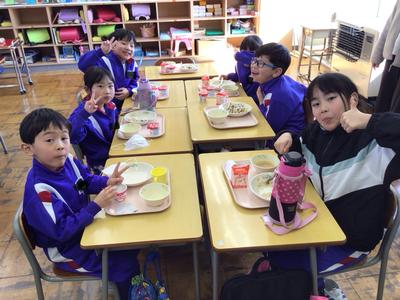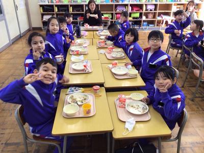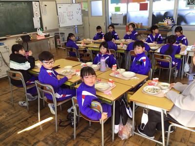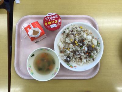 今日の献立は牛ごぼうピラフ、豆腐のスープ、ヨーグルト、牛乳でした。2年生教室の様子です。