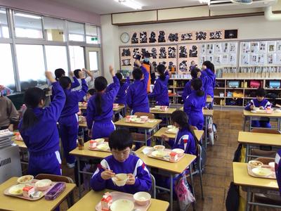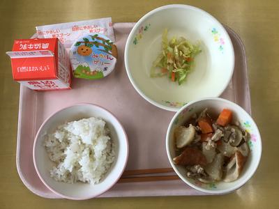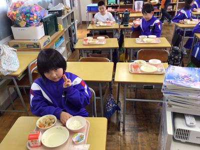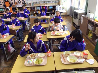 今日の献立はご飯、豚肉とこんにゃくの味噌煮、キャベツの梅和え、牛乳、みかんゼリーでした。4年生教室の様子です。