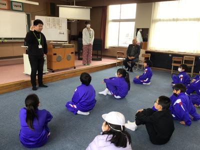 越前市出身の大学生が来校し、5年生を対象に越前市ジュニアリーダーズクラブのPRを行ってくださいました。越前市ジュニアリーダーズクラブは、中学生以上18歳以下の子どもたちで構成されており、ジュニアリーダー同士の交流を図り、お互いが学び合う中で、リーダーとしての資質の向上を図るとともに、豊かな心を養い、すすんで子ども会や社会に貢献することを目的としています。また、町内子ども会や学校行事に出向き、レクレーションを行ったり、キャンプの指導をしたりしてくれています。