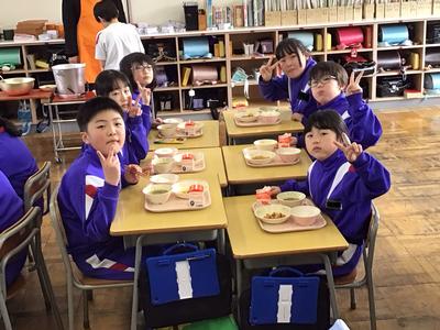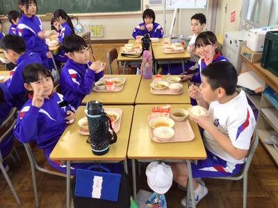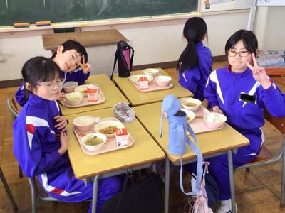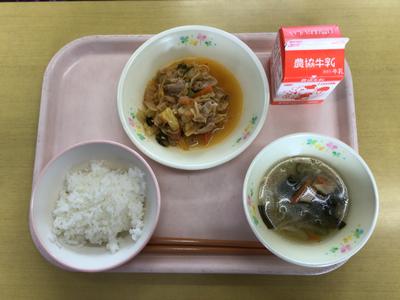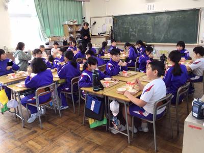 今日の献立はご飯、豚肉とキムチのピリ辛炒め、ミックススープ、牛乳でした。4年生教室の様子です。