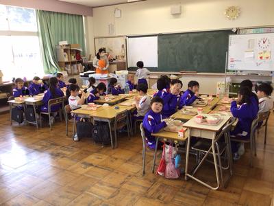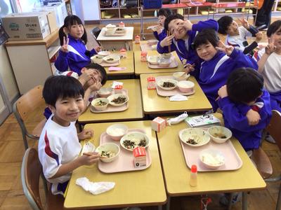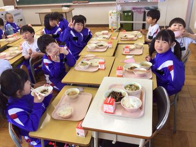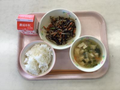 今日の献立はご飯、豚肉とひじきの炒め煮、揚げと野菜の味噌汁、牛乳でした。1年生教室の様子です。