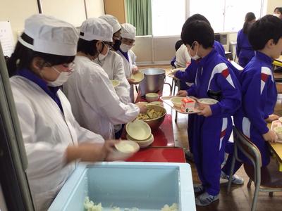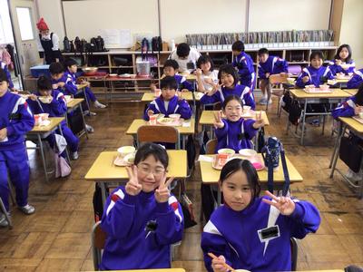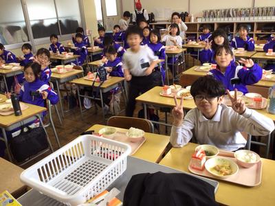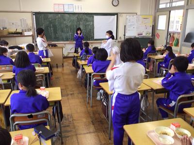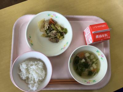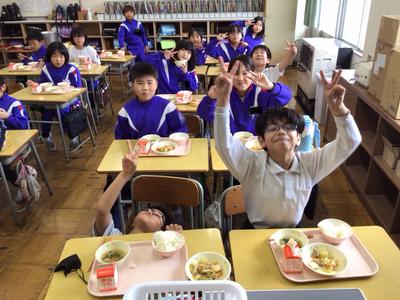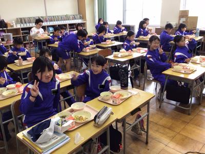 今日の献立はご飯、豚肉と野菜の味噌炒め、鶏ときのこのすまし汁、牛乳でした。3年生教室の様子です。