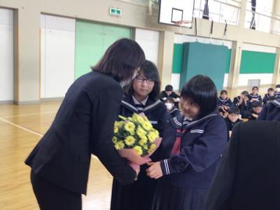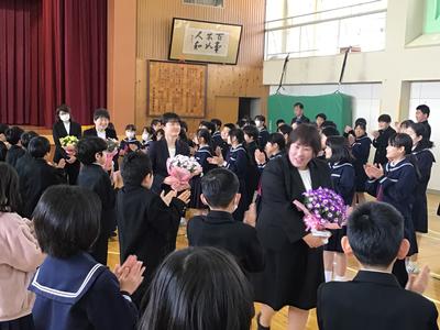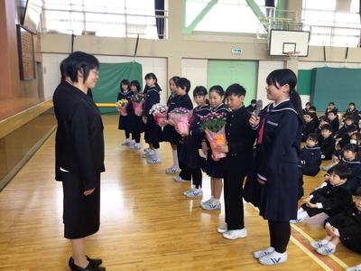 令和7年度も今日が最後の授業日となり、3学期終業式と修了式が行われました。校長からは、一年間で成長した自分を自分自身で褒めてあげてという話をしました。終業式・修了式に引き続き、離任式が行われました。今年度末の定期異動で神山小学校を去られる先生方一人ひとりに、代表児童から温かい感謝のメッセージと鉢花が贈られました。