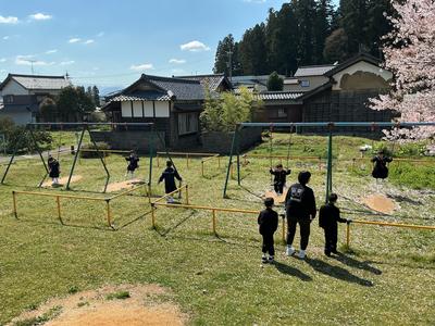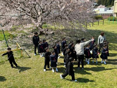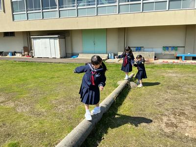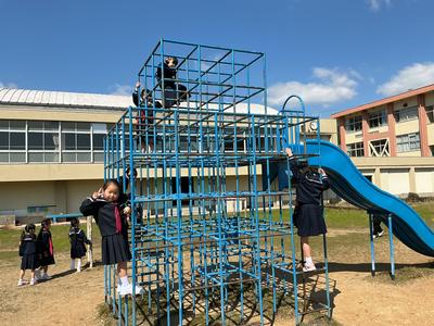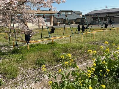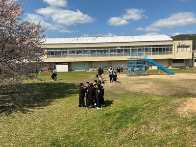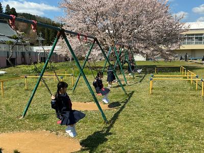 2時間目の中庭から、1年生の元気な声が聞こえてきました。まだ花びらの残る桜の木の下で記念撮影。その後は、鬼ごっこを楽しむ子、ジャングルジムやブランコで遊ぶ子など、仲良く思い思いに中庭中を駆け回っていました。