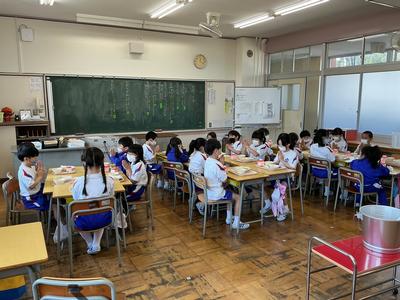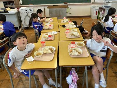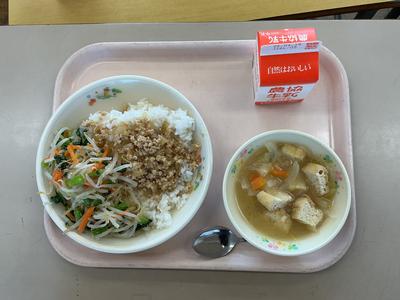 今日の献立は鶏そぼろの二色丼、揚げの味噌汁、牛乳でした。給食の調理員さん、今年度も安全・安心で栄養豊富な美味しい給食をよろしくお願いします。2年生教室の様子です。