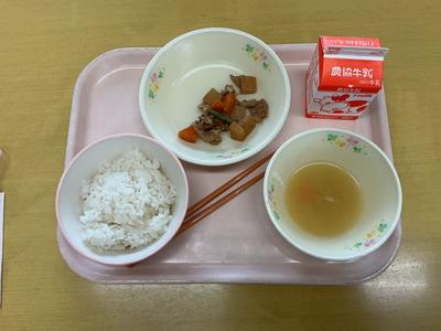 今日の献立は麦入りご飯、豚肉とじゃがいもの旨煮、玉ねぎとわかめの味噌汁、牛乳でした。4年生教室の様子です。