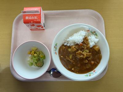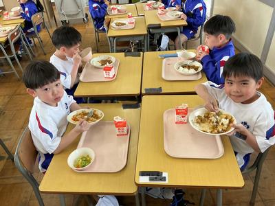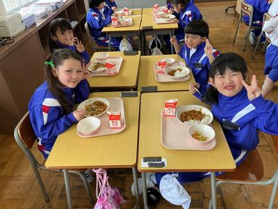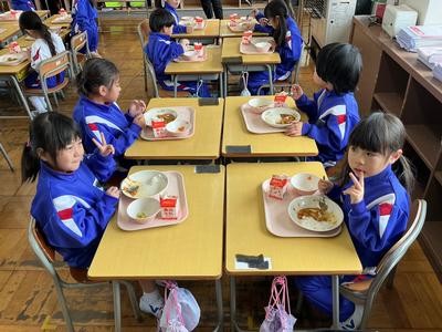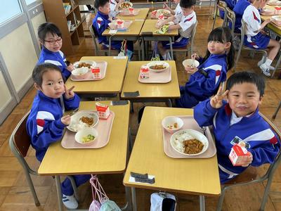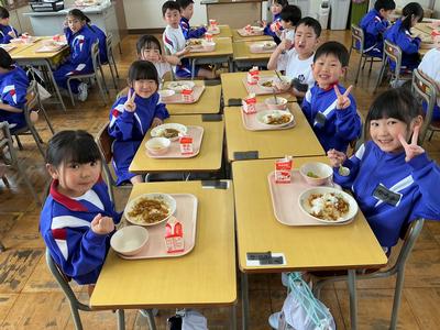 1年生にとって初めての神山小学校の給食でした。今日の献立はポークカレーライス、ドレッシングサラダ、牛乳でした。神山小学校の給食の味はいかがでしたか?