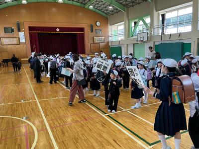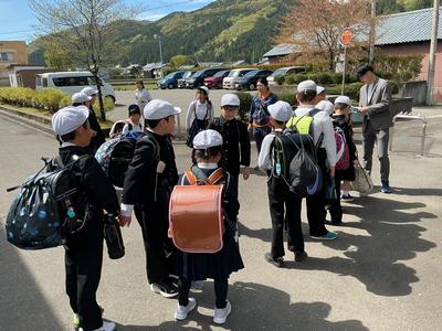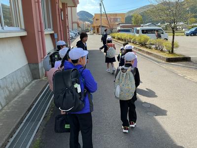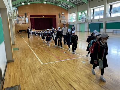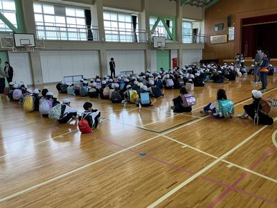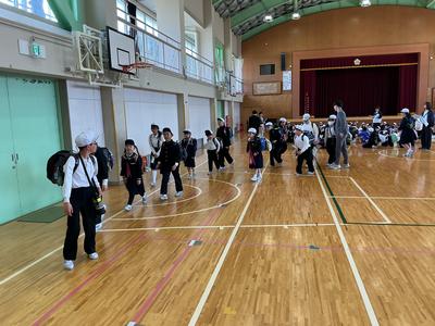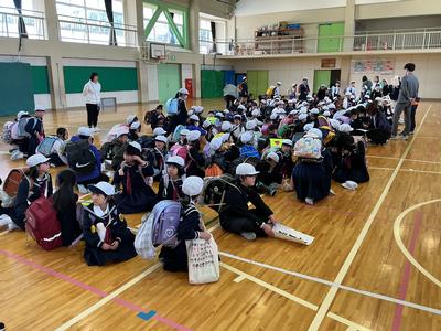 事件・事故の発生時や大雨や大雪、熊の出没等の災害時に備えた集団下校の訓練をしました。体育館に町内ごとに集まり、集団下校の目的を聞いた後、町内担当の教員引率の下、下校を始めました。班長を中心に気をつけて帰ってくださいね。