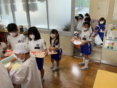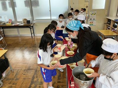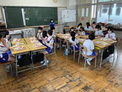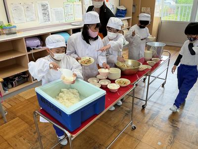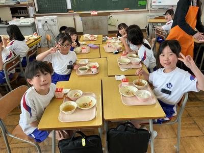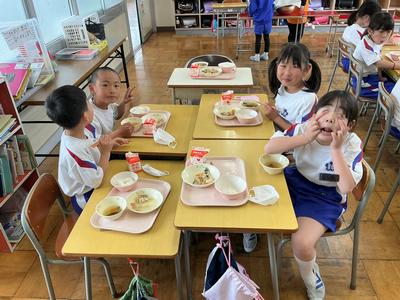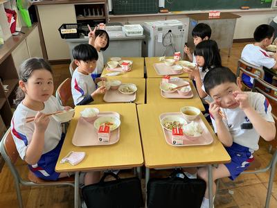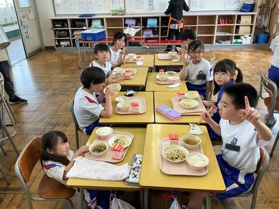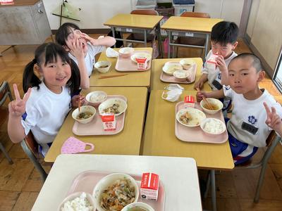 今日の献立はご飯、五目中華煮、わかめともやしのスープ、牛乳でした。2年生教室の様子です。
