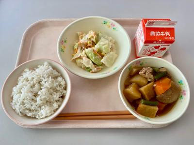 今日の給食は、ごはん、牛乳、鶏肉と大根のうま煮、ツナとキャベツのマヨネーズ和えです。うま煮には、大きな『里芋』が入っています。なんだか『冬』を感じます。