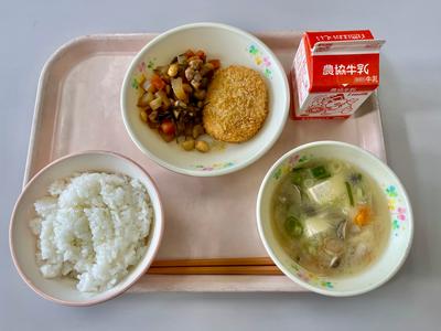 ごはん、牛乳、ビーフコロッケ、糸こんぶ入り煮豆、豆腐の味噌汁です。給食もあと10回となりました。いよいよ年末です!