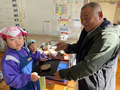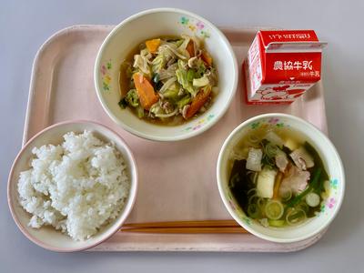 今日の給食は、ごはん、牛乳、豚肉と野菜の中華みそ炒め、とうふのスープです。スープに入っている大根は、学校園で採れた大根です。『おでん大根』なので、トロトロとしてたいへん甘いです。
