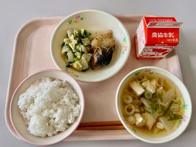 今日の給食は、ごはん、牛乳、さばの生姜煮、白菜と青菜のごま和え、けんちん汁です。さばには、血液がサラサラになる『DHA』『EPA』が豊富に含まれています。その量は、タラのなんと10倍です!