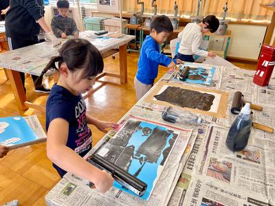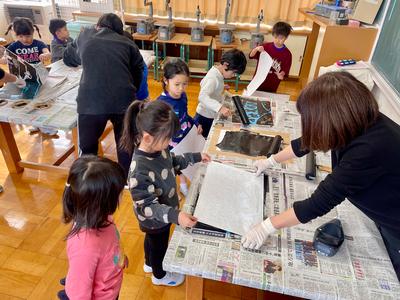 1年生の版画の『刷り』が始まりました!先生のアドバイスを聞きながら、ていねいにインクをつけ、バレンで刷ります。どんな出来になっているかな?紙をめくるときがドキドキです!