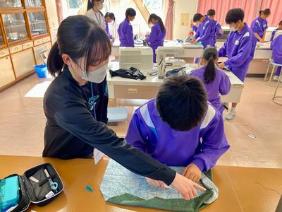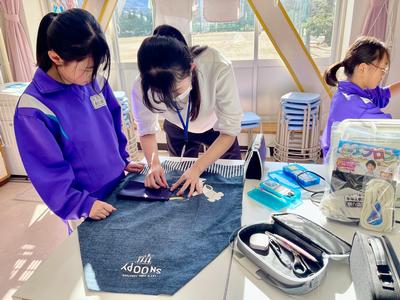 5年生のエプロンが仕上がってきました。仁愛大学の学生ボランティアさんの力も借りながら、急ピッチです!