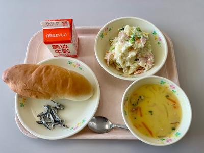 今日の給食は、コッペパン、牛乳、ポテトとハムのサラダ、コーンポタージュ、にぼしです。コーンポタージュに使われる『ベシャメルソース』のいい香りが、2校時から漂っていました!