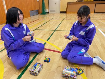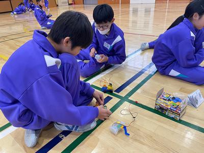 6年生が『電気の利用』の発展学習に取り組んでいました。モーターを回して充電し、車を走らせたり、LEDランプをつけたりします。とにかく回してパワーをためています!