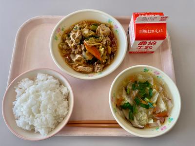 今日の給食は、中華丼、牛乳、とうふとジャガイモのスープです。今日は発熱で欠席する子供たちが多くいました。うがい・手洗い・換気をしっかり行って、給食を食べています。