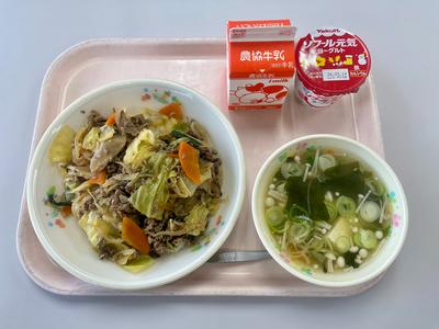 今日の給食は、プルコギ丼、牛乳、えのきとわかめのスープ、ヨーグルトです。『プルコギ』の『プル』は『火』、『コギ』は『肉』という意味です。