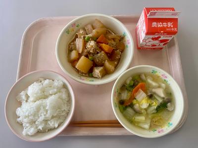 今日の給食は、ごはん、牛乳、揚げのそぼろ煮、とうふと白菜の味噌汁です。揚げのそぼろ煮は、コクと甘みがあり、ごはんとの相性ばっちりでした。
