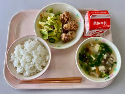 今日の給食は、ごはん、牛乳、鶏肉のから揚げ、キャベツときゅうりのサラダ、とうふとしめじのスープです。安定のおいしさの『から揚げ』です。