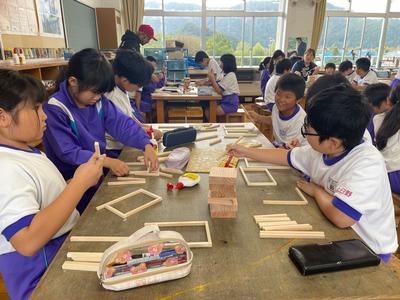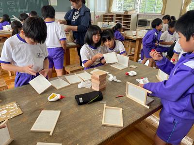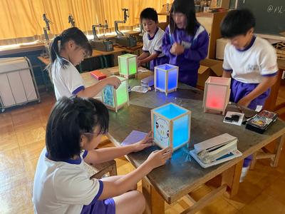 今日の3年生の図工は、地域の先生をお招きして『アート』な作品づくりに取り組みました。笏谷石と越前和紙を組み合わせた『笏谷和紙』を活用した『行燈づくり』です。笏谷石の自然な青みもきれいなのですが、ライトをつけた瞬間「うわー!」という歓声が上がりました。
