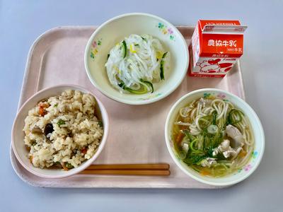 今日の給食は、油揚げご飯、牛乳、大根の菊花和え、麦とろ麺のすまし汁の『市政記念献立』です。油揚げや菊花、麦とろ麺など、越前市満載のメニューでした。