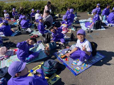 『矢放神社』『コウノトリの巣塔』『帆山公園』のチェックポイントを通過し、日野川河川敷に集合しました。みんなでおいしいお弁当です。保護者のみなさま、ご準備ありがとうございました。