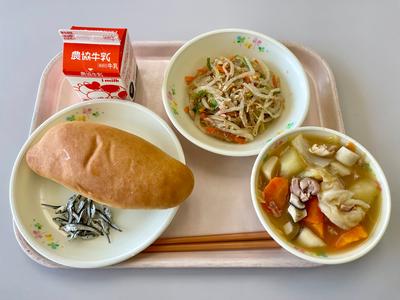 今日の給食は、コッペパン、牛乳、じゃがいもとチキンのスープ煮、もやしとツナのサラダ、にぼしです。スープ煮には『しいたけ』が入っていたのですが、『かさ』の部分はもちろん、細かく刻まれた『じく』の部分もコリコリとしておいしかったですよ。