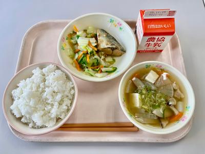 今日の給食は、ごはん、牛乳、さばのみそ煮、いろどりおはづけ、のっぺい汁です。おはづけとのっぺい汁合わせて9種類もの野菜が入っています!