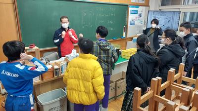 6年生が『電気の利用』の発展学習に取り組んでいました。モーターを回して充電し、車を走らせたり、LEDランプをつけたりします。とにかく回してパワーをためています!