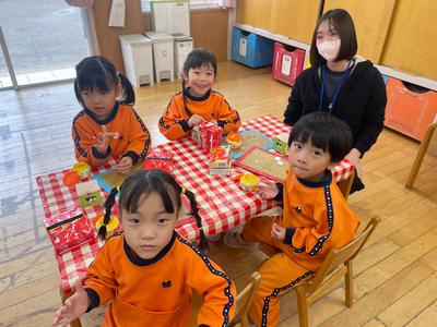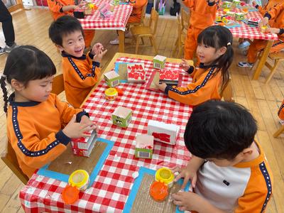 認定こども園北日野にも行ってきました。お菓子の空き箱を使って『ししまい』をつくっていましたよ。
