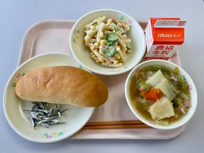 今日の給食は、コッペパン、牛乳、チキンポトフ、マカロニサラダ、にぼしです。ポトフのトロトロ白菜が、体を温めてくれます。