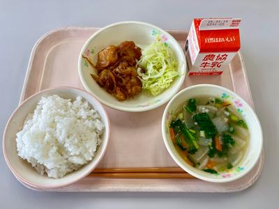 今日の給食は、ごはん、牛乳、揚げ鳥の柚子風味、ボイルキャベツ、七草汁です。七草汁は、出汁が大根にしっかりとしみていて、『体をいたわる味』でした。明日から3連休です。雪があまり降らないと嬉しいです。