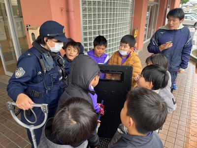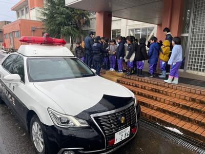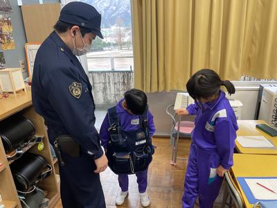 3年生が、駅前交番で働く『お巡りさん』に来ていただき、『事件や事故からくらしを守る』のまとめの学習に取り組んでいました。『対人防護衣』を実際に着せていただいたり、パトカーの中を見せていただいたり、大興奮の45分間でした。