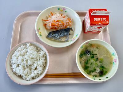 今日の給食は、ごはん、牛乳、鰆の塩焼き、紅白なます、雑煮の『鏡開き献立』です。『鏡開き』とは、神様にお供えした鏡餅を下ろして食べ、神様への感謝を表し無病息災を願うものです。