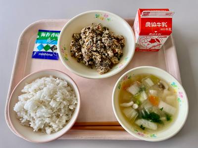 今日の給食は、ごはん、牛乳、豚肉と野菜の中華みそ炒め、カブのかきたまスープです。感染症が流行してきました。栄養と睡眠をしっかり摂りましょう!