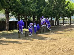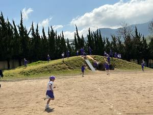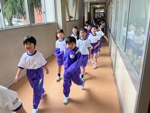 3時間目の体育の時間には、グラウンドに出て、準備体操をしたりかけっこをしたりしました。一生懸命走りました。友達を応援する声もあがっていました。