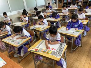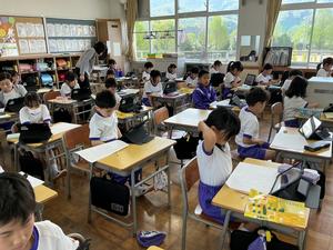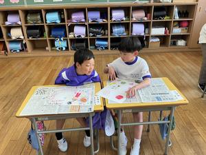 1年生は、3・4時間目に図工をしました。今日は、クレヨンを使って、好きな絵を描きました。好きな食べ物や、すきな遊びなど、思い思いにのびのびと描いていました。絵を描いた後は、となりのお友達と何を描いたか教え合いました。