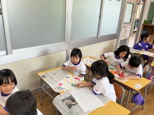 2組の図工では、いろいろな手法で、絵を描きました。「水で薄めた絵の具を塗り、ストローで伸ばす」「網に色を付け、歯ブラシでこする」などです。絵の具が、思わぬほうに広がったり散ったりするのを楽しみながら、絵を描くことができました。