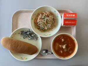 今日の給食のメニューは、コッペパン、ポークビーンズ、もやしとツナのサラダ、にぼし、牛乳でした。ポークビーンズは、トマトのスープに豆、エリンギなどたくさんの具材が入っていました。サラダは、もやしときゅうりがしゃきしゃきでした。今日の給食も、美味しかったです。1年生も、初めてのパンの給食でしたが、しっかり食べることができました。