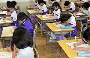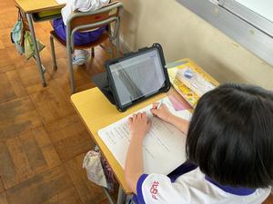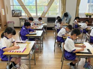 1年生は、国語の時間に、鉛筆をもって、まっすぐな線や階段状になっている線をなぞる練習をしました。先生が、「足はぺったん、せなかはぴん」と声をかけると、背筋をすっと伸ばして、丁寧になぞっていました。